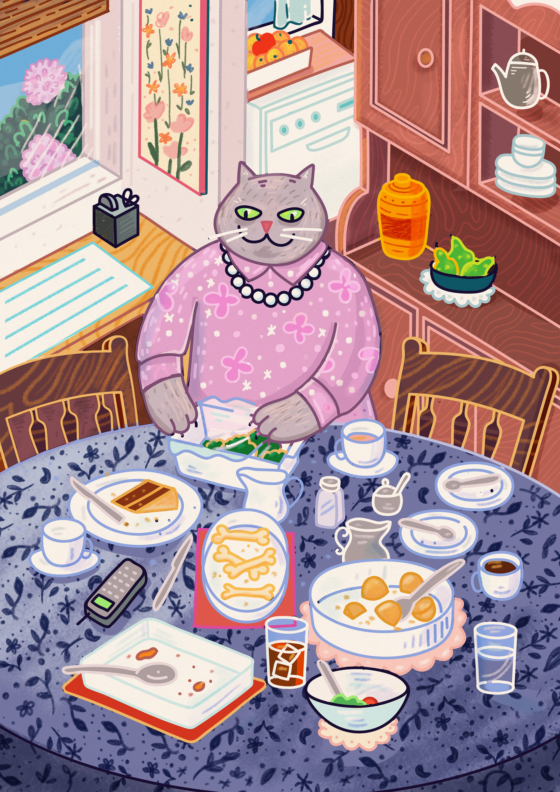 I chose to do an illustration instead and drew my grandmother as her beloved cat mimi, after one of her famous Sunday lunches.