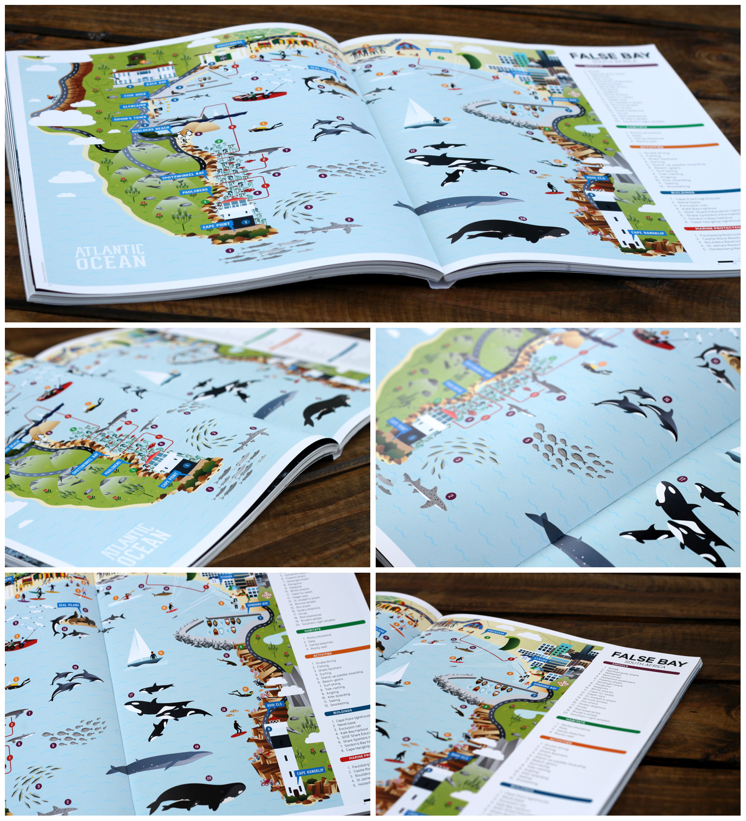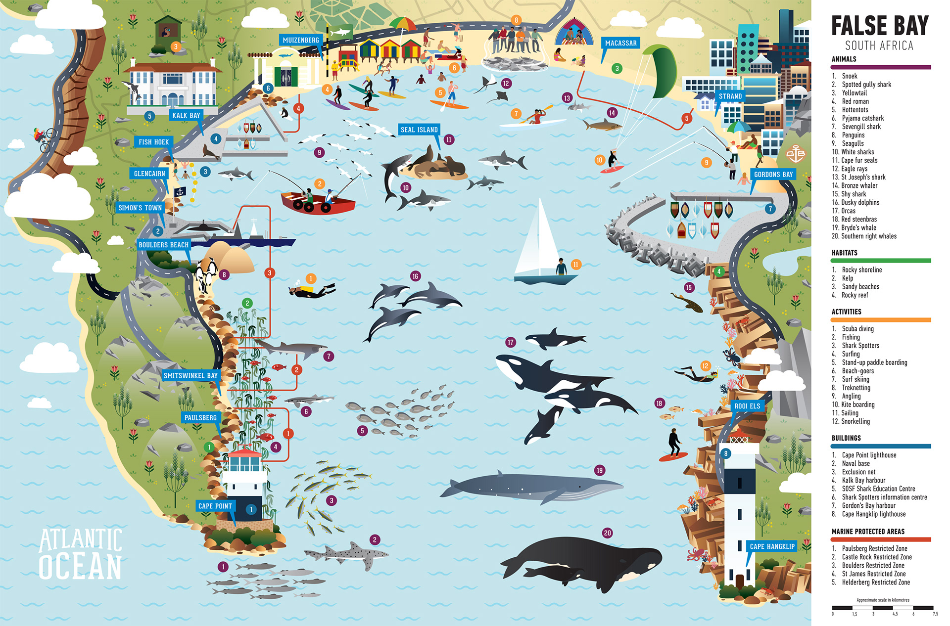 A map of False Bay that highlights the diverse marine life, activities and landmarks of the area, commissioned by Save Our Seas Foundation for the Summer 2015 issue of their magazine, which can be viewed here: http://saveourseas.com/magazine/summer-2015-issue-3/