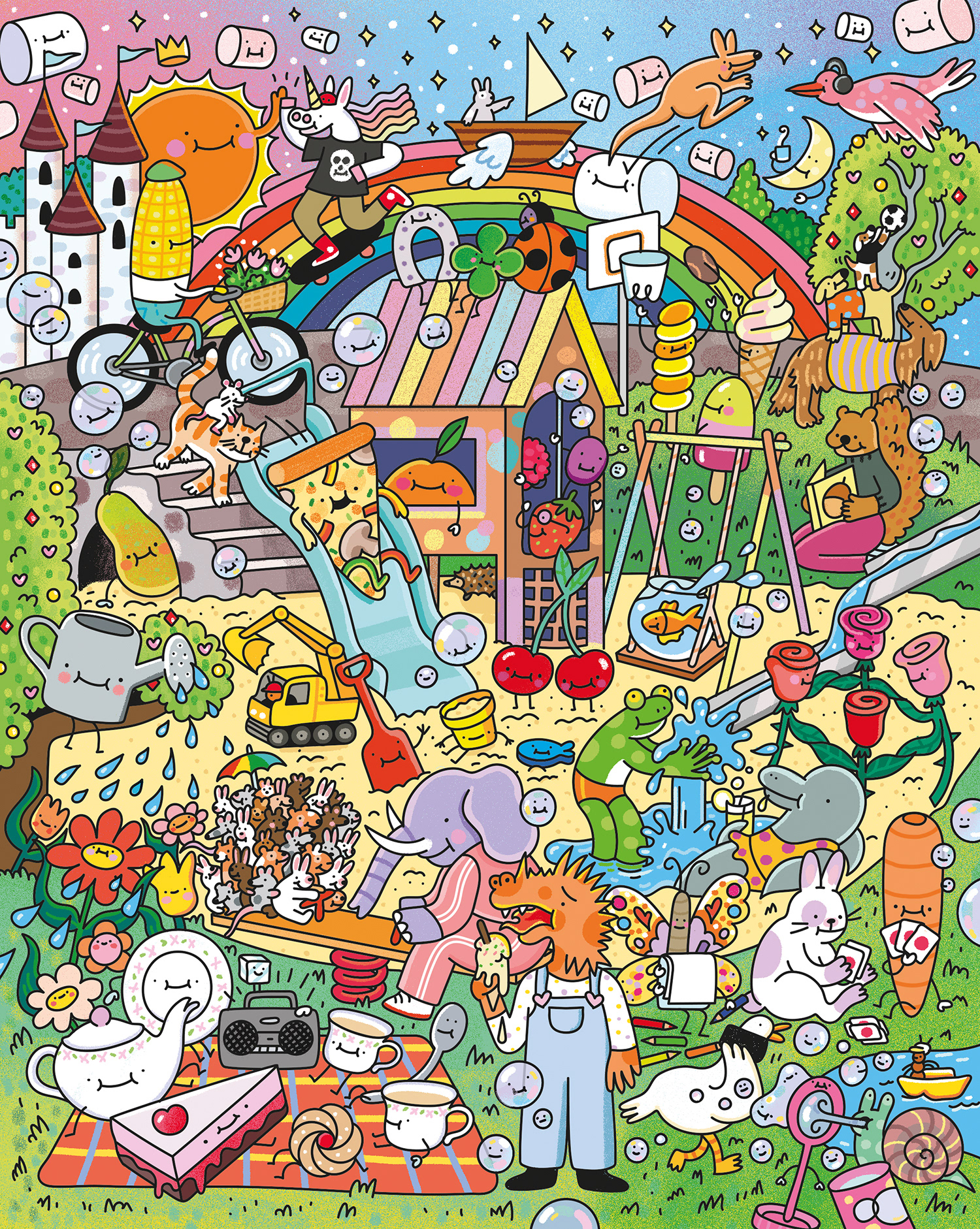 Busy children's illustration of a playground, featuring some silly scenes.