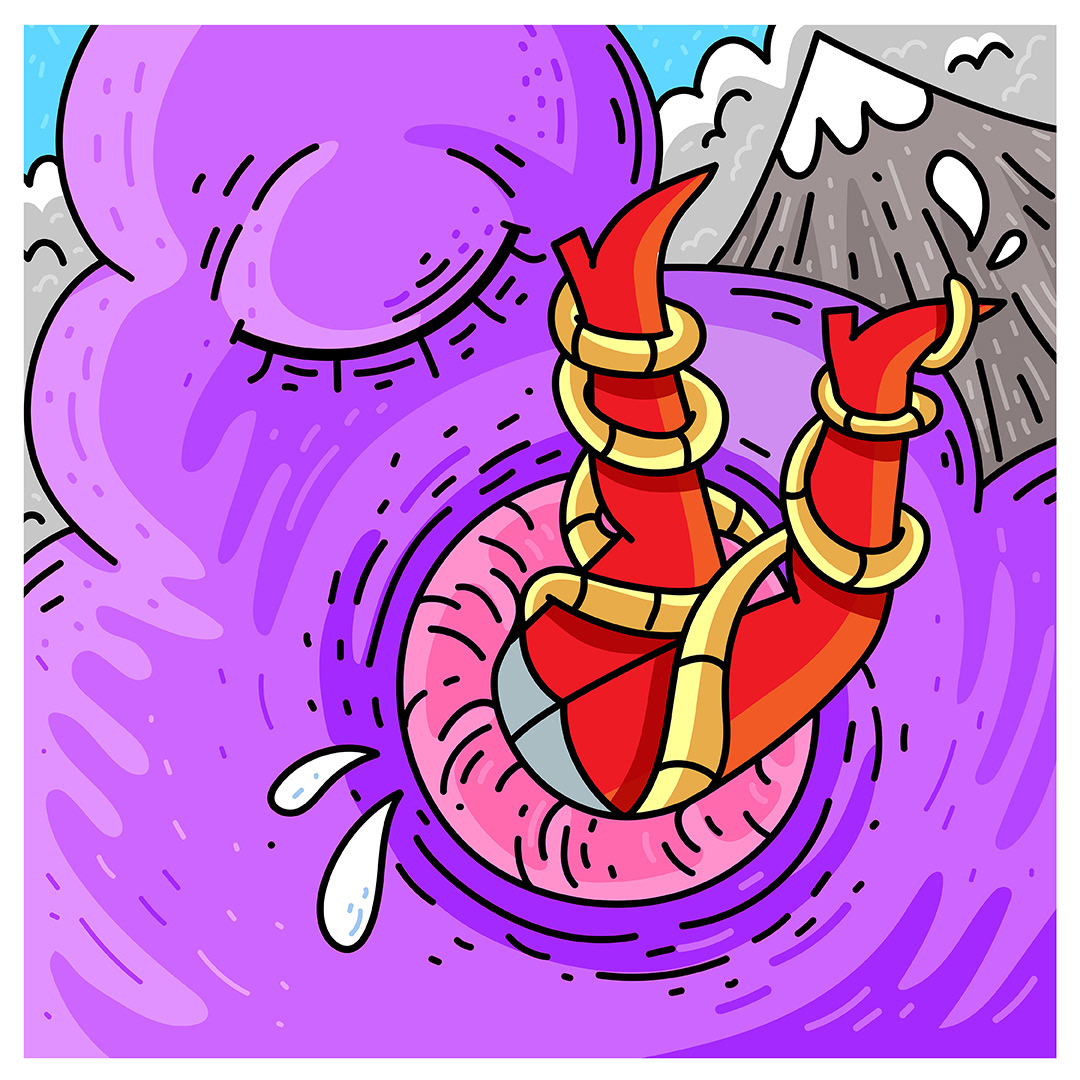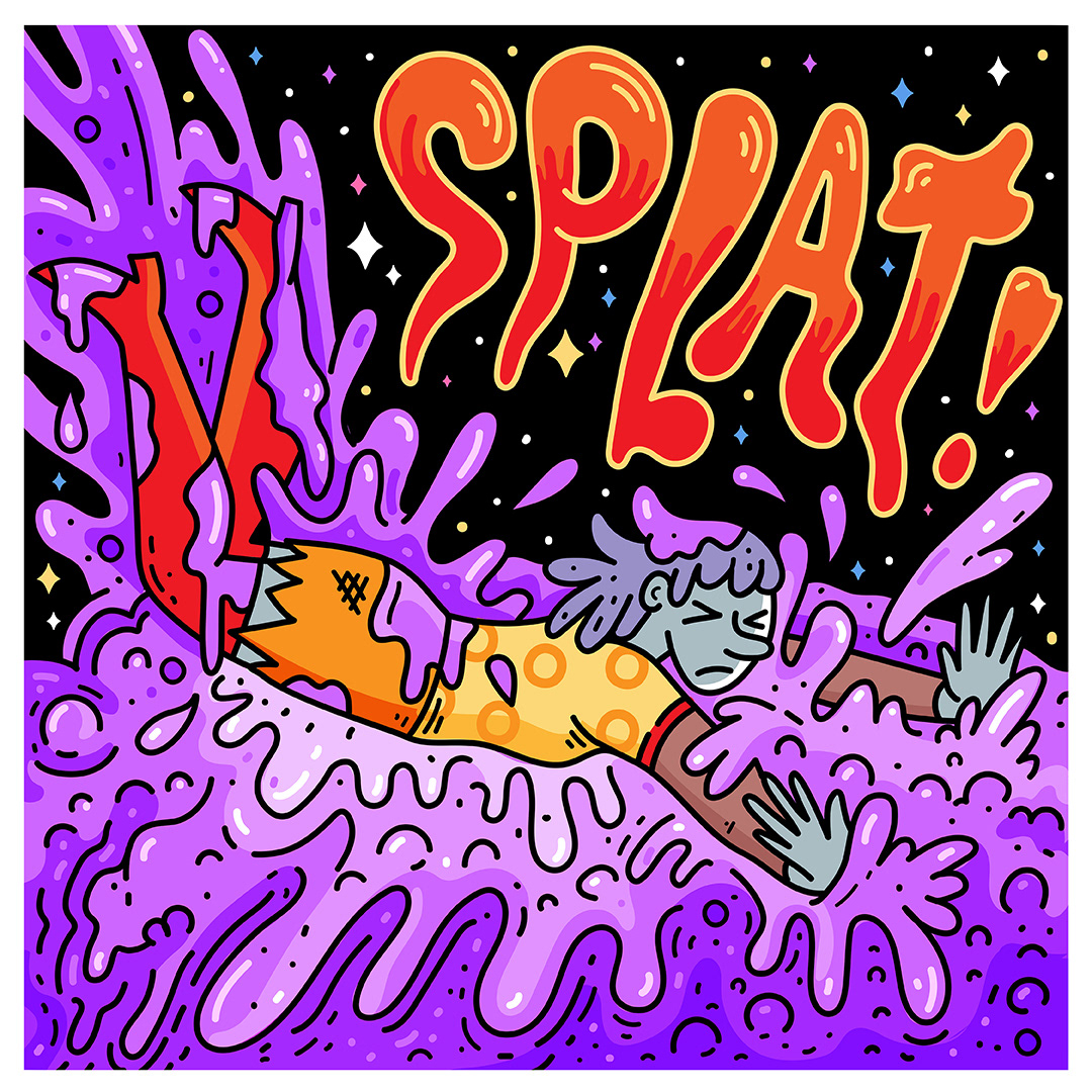 a community-based, ongoing, mute chain-comic that features three panels from different artists around the world who all contribute to the story using their own unique styles, this was my bit; featuring the character getting slurped up by a blob monster!