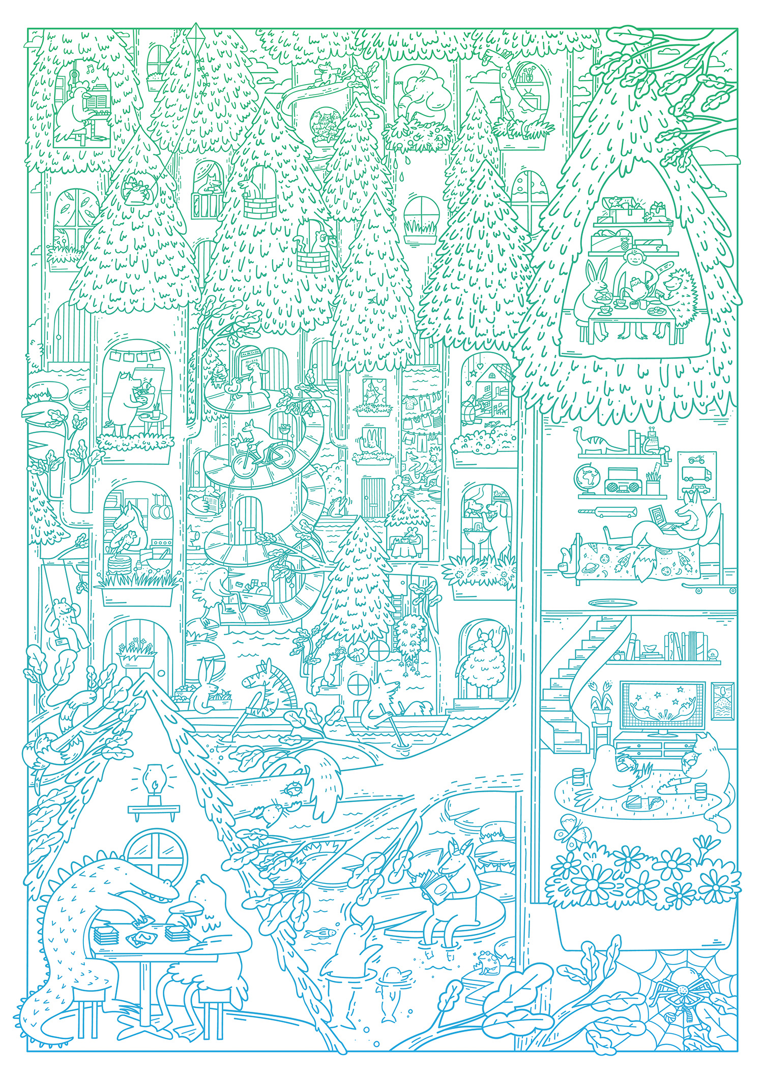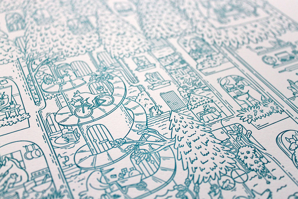 A children's illustration of a very busy place, called Waldville, curated and printed by Essie Letterpress.