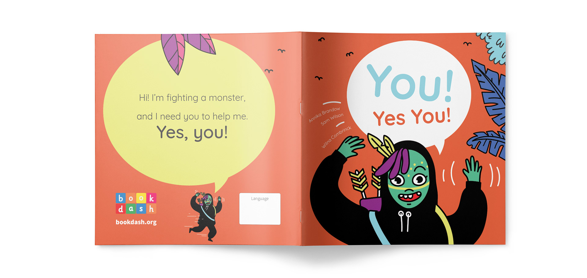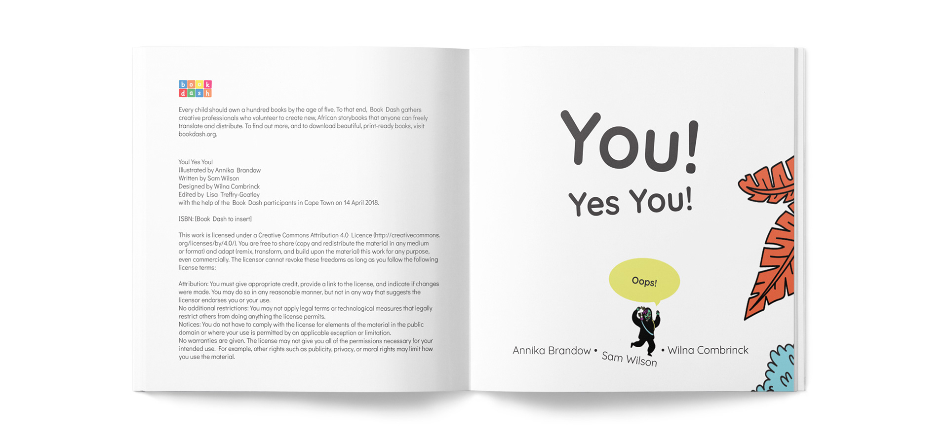 Book Dash books are made by a team of three creatives – a writer, an illustrator and a designer – who work together during a 12-hour book-making event (called a Book Dash) to create open source children's storybooks. Book Dash books are made available online after the event under a Creative Commons Attribution licence. Everyone volunteers their expertise, including a support team of editors, technical directors and facilitators. You can read more about Book Dash here. You! Yes You! was created at Book Dash Cape Town in 2018.